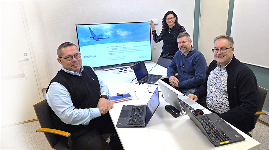 Kuva: Hankkeessa marraskuun alussa aloittaneet Petteri Kurkinen (vasemmalla) ja Jussi Kuusiniemi (keskellä) vahvistavat Prizztechin turvallisuustiimiä. Turvallisuustiimin toimintaa koordinoiva Marika Lähde ja yrityspalveluiden johtaja Jari-Pekka Niemi Prizztechistä ovat tyytyväisiä, että uuden hankkeen myötä satakuntalaisille yrityksille tarjoutuu mahdollisuus päästä mukaan kasvavalle alalle.