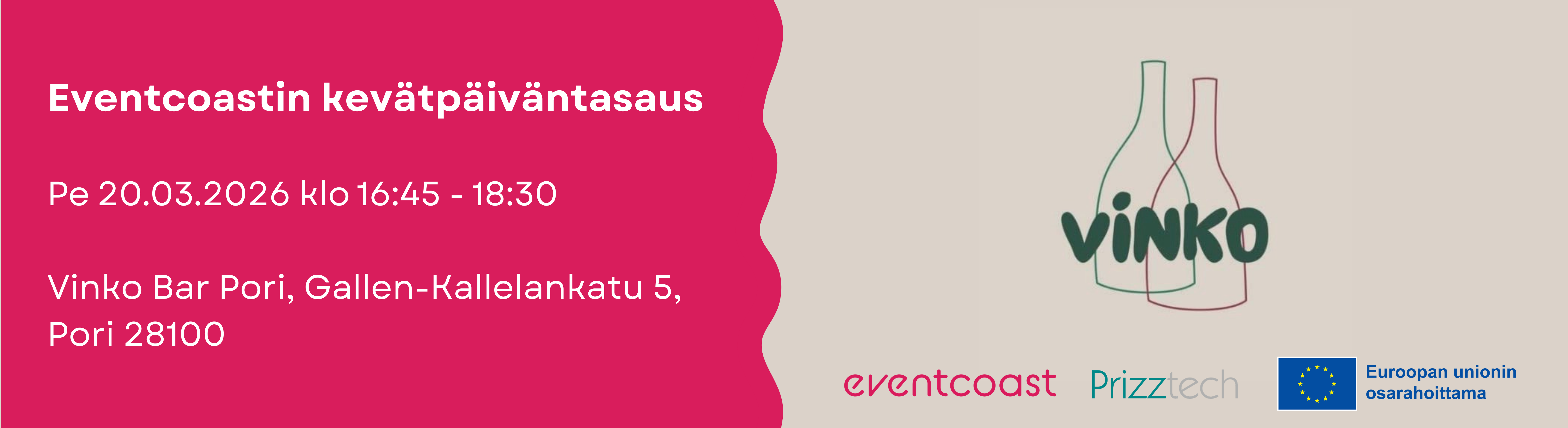 Tervetuloa Eventcoastin ensimmäiseen kevätpäiväntasaukseen! Kokoonnutaan yhdessä juhlistamaan kevään alkua Porin viihtyisään viinibaari Vinkoon tapasten äärelle. Ei agendaa eikä esityksiä, tule vain paikalle juttelemaan ja vaihtamaan kuulumisia vanhojen ja uusien tapahtumakollegoiden kanssa. Luvassa herkullisia ruoka- ja juomatarjouksia, joista voit nauttia omakustanteisesti oman maun mukaan. Tarjolla mm. pieni tapaslautanen: juustoja, leikkeleitä, tuoreita hedelmiä, oliiveja ja siemennäkkäriä. Saatavilla myös alkoholiton sekä kasvisvaihtoehto. Tapas + talon viini 11 €/hlö. Ilmoittaudu mukaan, jotta keittiö osaa varautua. Nähdään Vinkossa!