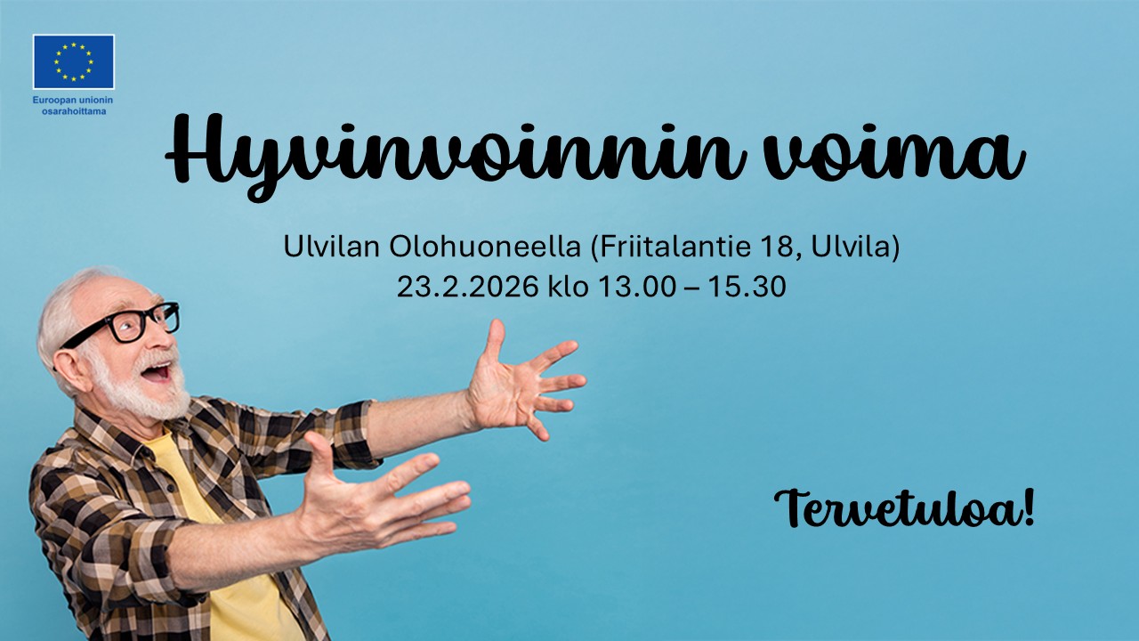 Lämpimästi tervetuloa Hyvinvoinnin voima -tilaisuuteen 23.2.2026 klo 13.00-15.30! Tapahtuma keskittyy ikäihmisten hyvinvoinnin edistämiseen. Tapahtumassa pääset mm. kuulemaan kokonaisvaltaisesta hyvinvoinnista, testaamaan toimintakykyäsi sekä osallistumaan yhteislauluun.