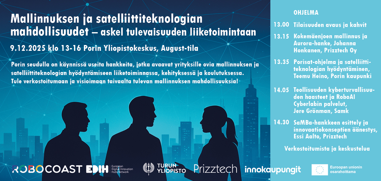 Porin seudulla on käynnissä useita hankkeita, jotka avaavat yrityksille ovia mallinnuksen ja satelliittiteknologian hyödyntämiseen liiketoiminnassa, kehityksessä ja koulutuksessa. Tule verkostoitumaan ja visioimaan taivaalta tulevan mallinnuksen mahdollisuuksia! Tilaisuuden järjestää Satakunta Metaversum for Business -hanke.