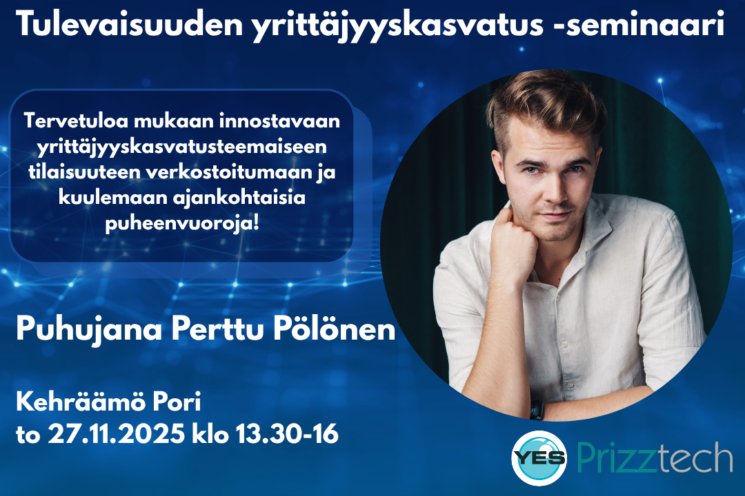 Tervetuloa Porin Kehräämöön torstaina 27.11. klo 13.30-16 verkostoitumaan ja kuulemaan ajankohtaisia puheenvuoroja yrittäjyyteen ja yrittäjyyskasvatukseen liittyen!